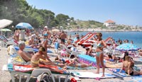 Allgemeine InfosDie Makarska-Riviera ist geprägt von unzähligen Buchten und einer Küste mit schmalen, oft von Bäumen beschatteten Kiesstränden. In der Hochsaison ist es je nach Urlaubsort schwierig, einen »ruhigen« Platz am kristallklaren Wasser zu finden – meist muss man sich dafür weit genug von den Ferienorten entfernen. Und die »einsamen« Plätze, wie sie in den Imagebroschüren gerne hervorgehoben werden, sind meist auch keine Geheimtipps mehr, wie die Anzahl an geparkten Pkw an den oberhalb gelegenen Straßen signalisiert. Die meisten Ortschaften haben am Wasser entlang Promenaden angelegt, an denen es sich schön spazierengehen oder entlangradeln lässt. Der Küstenstreifen der Makarska-Riviera ist relativ dicht bewaldet, und um die Orte wird ein wenig Landwirtschaft betrieben. Der Küste vorgelagert sind die Inseln Brac, Hvar und die Halbinsel Peljesac, hinter der sich je nach Standort auch die Insel Korcula erkennen lässt.![]() In der Hochsaison wird es am Strand, wie hier in Makarska, schon einmal eng Hauptverbindung von Split in Richtung Dubrovnik ist die Küstenstraße, die oberhalb der meisten Ortschaften verläuft und in den meisten Fällen schöne Auslicke auf die Küstenlinie und die Orte bietet. Während auf der einen Seite der Straße das Blau des Meeres in der Sonne funkelt, dominiert auf der anderen Seite der Küstenstraße das mächtige Biokovo-Gebirge. An dessen Hängen sieht man einige verlassene Ortschaften, deren Bewohner sich inzwischen hinunter zum Meer orientiert und ihre alten Häuser aufgegeben haben. Am flexibelsten lässt sich die Makarska-Riviera mit dem Auto erkunden, aber auch wer nicht über einen fahrbaren Untersatz verfügt, kann von seinem Urlaubsort aus Ausflüge unternehmen. Entlang der Küstenstraße fahren mehrmals täglich Linienbusse, die für wenig Geld für Mobilität sorgen. Einen größeren Busbahnhof gibt es in Makarska. Die Haltestellen der einzelnen Orte liegen in der Regel an der Küstenstraße. Meist muss man daher mehr oder weniger weit zu dieser hochlaufen. Auch Tagestouren lassen sich in der Kombination Bus und Fähre bei zeitigem Start gut unternehmen – etwa von Makarska aus zur Insel Brac oder von Drvenik aus zur Insel Hvar.