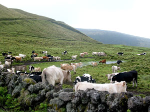 ![]() Begegnung im Hochland: Kühe auf der Straße (Foto: Eichner-Ramm) Im HochlandNicht versäumen sollte man eine Tour ins einsame östliche Hochland Picos. Fast die gesamte Insel lässt sich übrigens der Länge nach von Madalena aus durchqueren. Mehr Infos zum westlichen Teil gibt es im Globetrotter-Seiten-Kapitel Pico-West. Den Anschluss in den Osten erreicht man von der Nord-Süd-Achse der A 2 aus, von Lajes kommend kurz vor dem Cabeço da Cruz.![]() Markant: Ein großer Stein weist auf die Mistério da Praínha hin (Foto: Eichner-Ramm) Von der E 2 geht es auf schmaler, aber asphaltierter Straße ostwärts. Hier oben ist Weideland. Wacholderheidebüsche und Hortensienhecken säumen die von saftig grünen Wiesen bedeckte hügelige Landschaft. Auch Natursteinmauern aus Lavabrocken durchziehen das Gelände. Zumeist sind sie mit einer dicken Moos- oder Flechtenschicht bedeckt. Immer wieder rücken kleinere Vulkankegel ins Blickfeld. Verkehr herrscht praktisch keiner. Dennoch sollte man sich als Fahrer nicht zu sehr von der herrlichen Landschaft und den Ausblicken ablenken lassen. So kann es durchaus vorkommen, dass hinter einer der vielen Kurven plötzlich eine Herde Kühe auf der Straße steht.